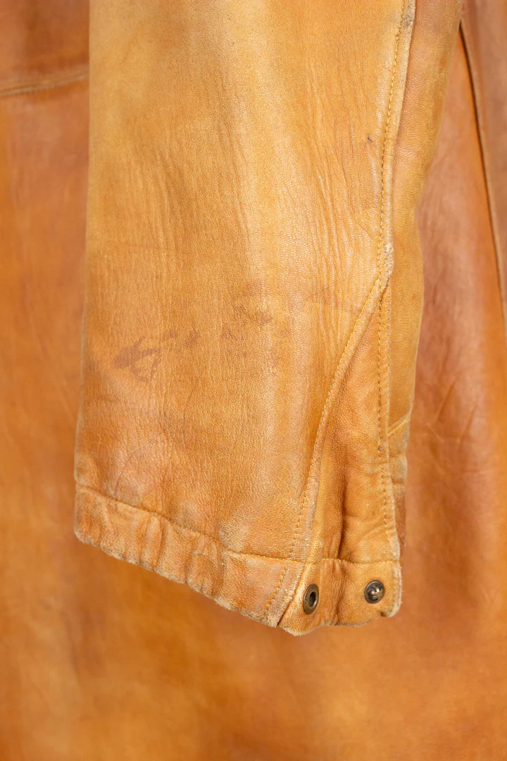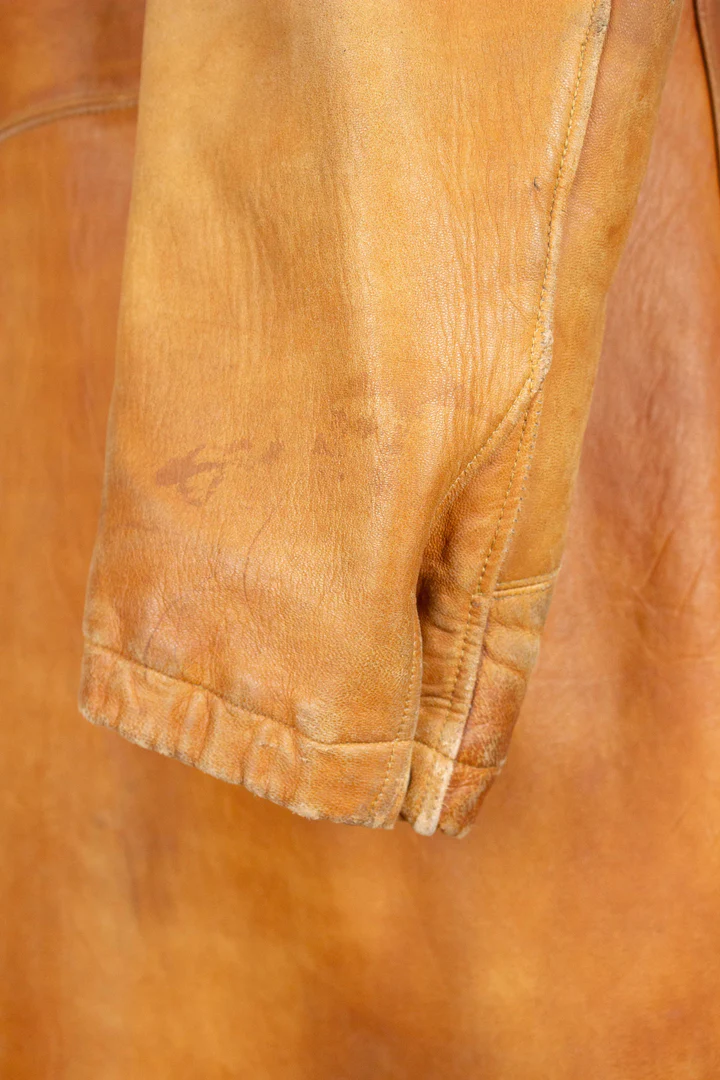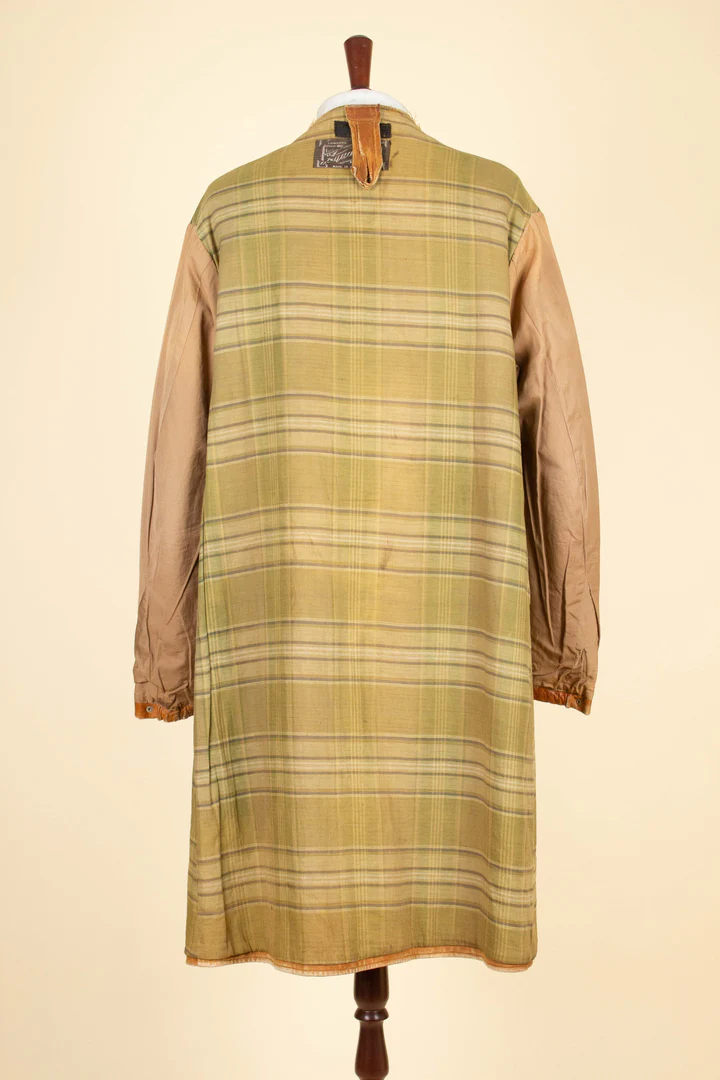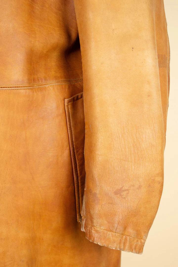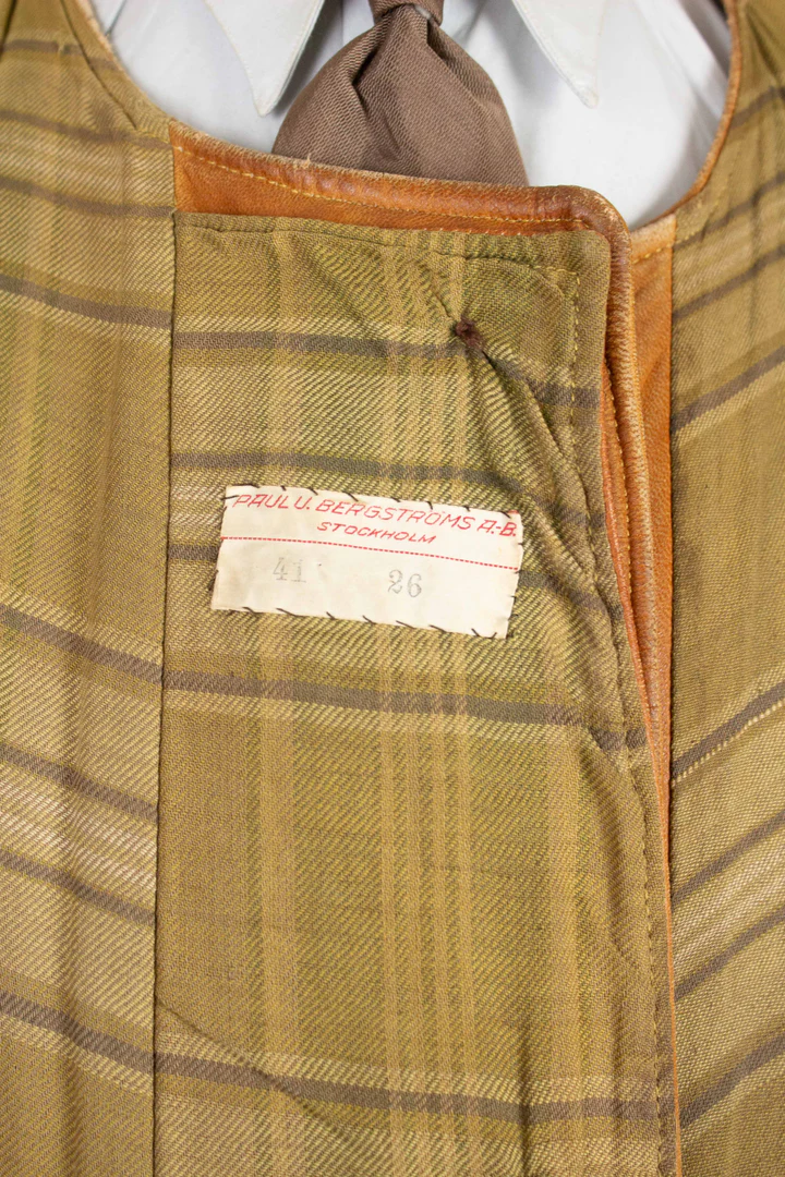 Back in the 1920s and 30s, leather garments in Sweden were almost always locally made. Very few English imports existed, and this chauffeur’s coat, made by “Aquatites,” is an exceptional example. Its soft, supple nappa leather, light brown patina, and precise single-breasted construction speak to a time when craftsmanship was everything. Inside, the green checkered cotton lining and thoughtful features like horizontal pockets, adjustable press-stud cuffs, and a leather hanging loop carry both style and utility.