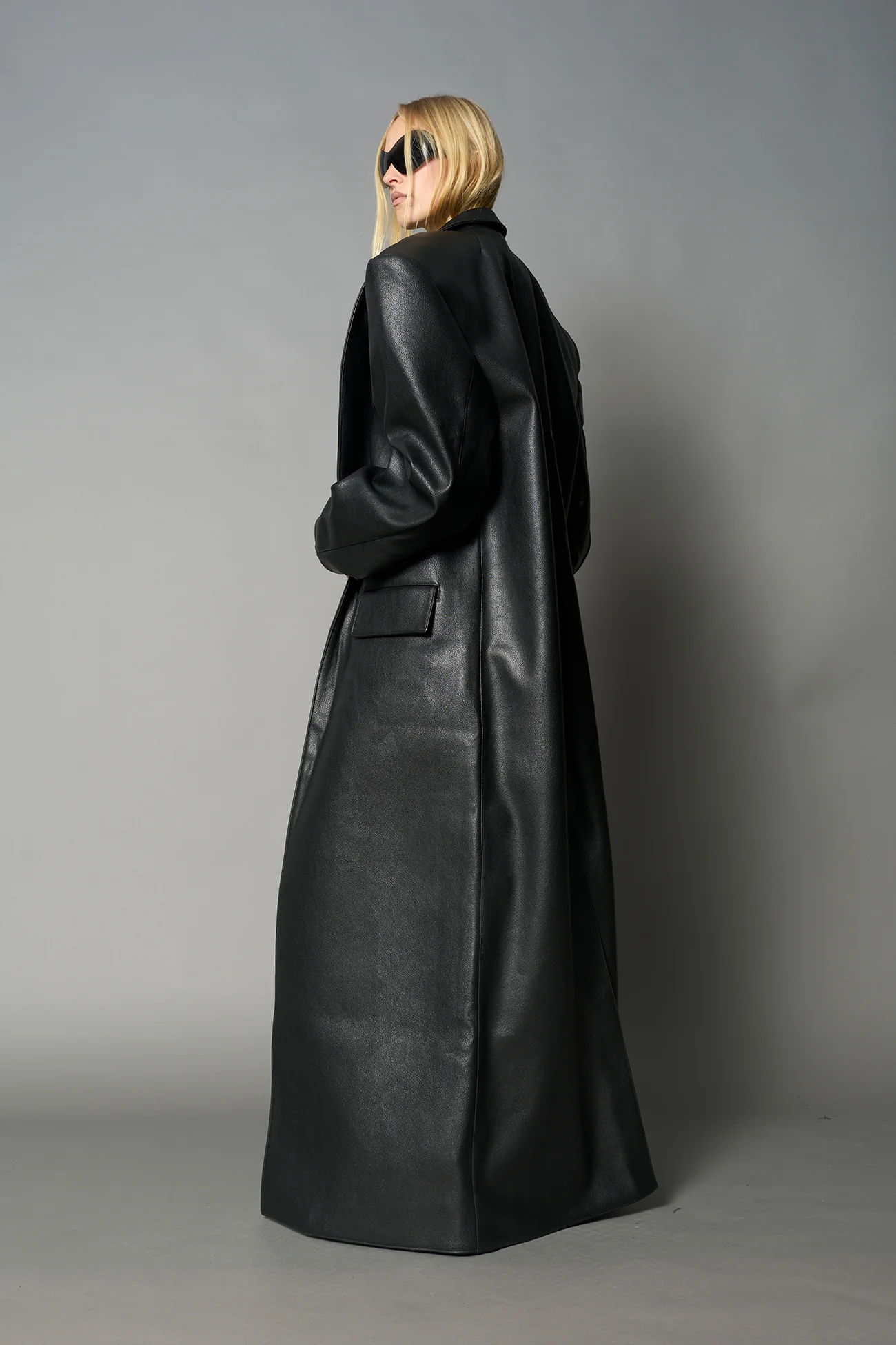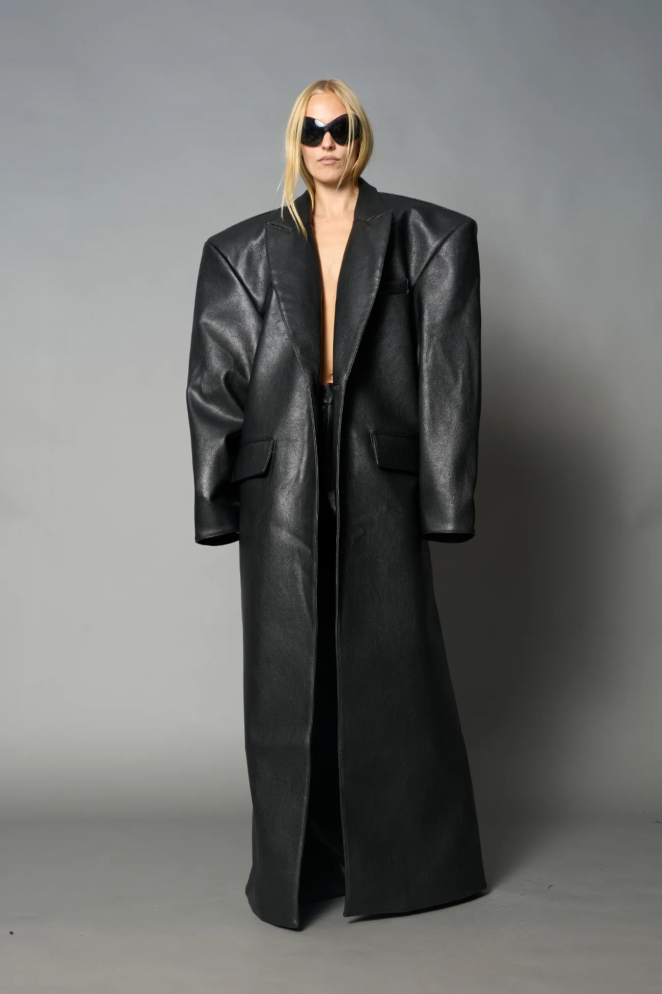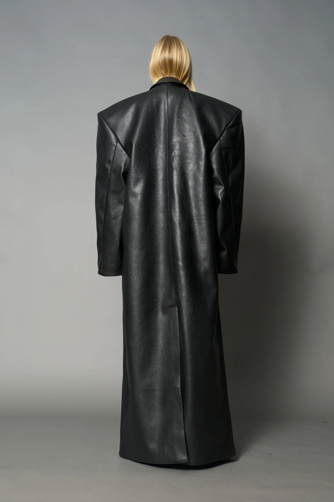 This Floor Length Leather Duster is a power dressing at its finest. With internal boning for ultra-structured shoulders, a dramatic hemline, and an oversized fit, this duster moves with both elegance and impact. Every detail, from the single-breasted front and button closure to the flap pockets at the hip and fully lined interior, has been designed for comfort, movement, and undeniable style.
