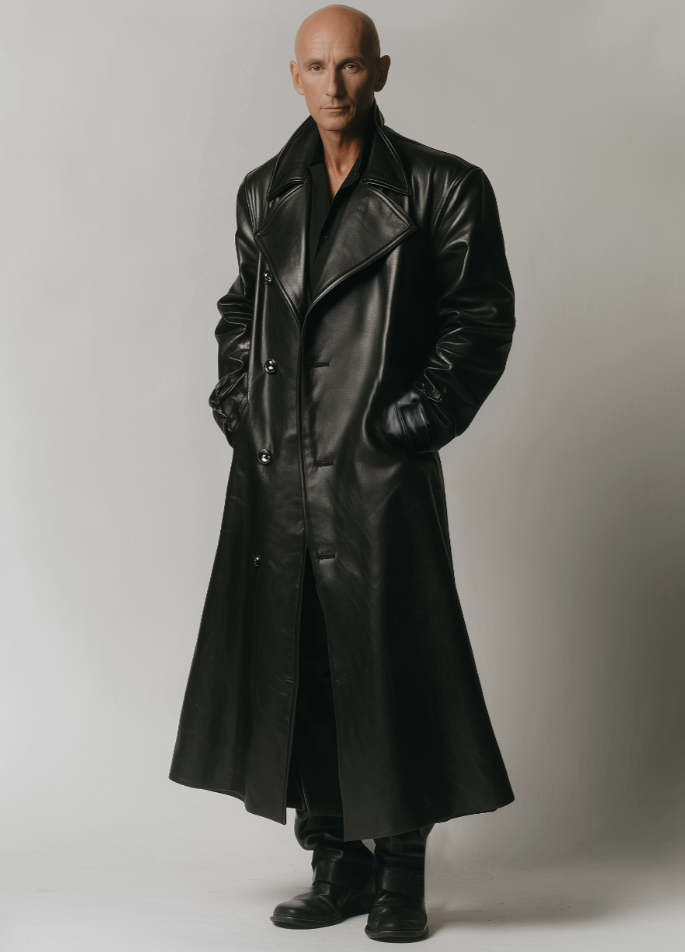 Layer over tailored trousers or slim jeans, finish with dress shoes or sleek boots, and watch every eye follow the flow and structure of the coat. In low light, the matte black leather speaks the loudest, enhancing shadows and lines to a new level of drama.